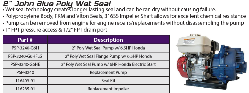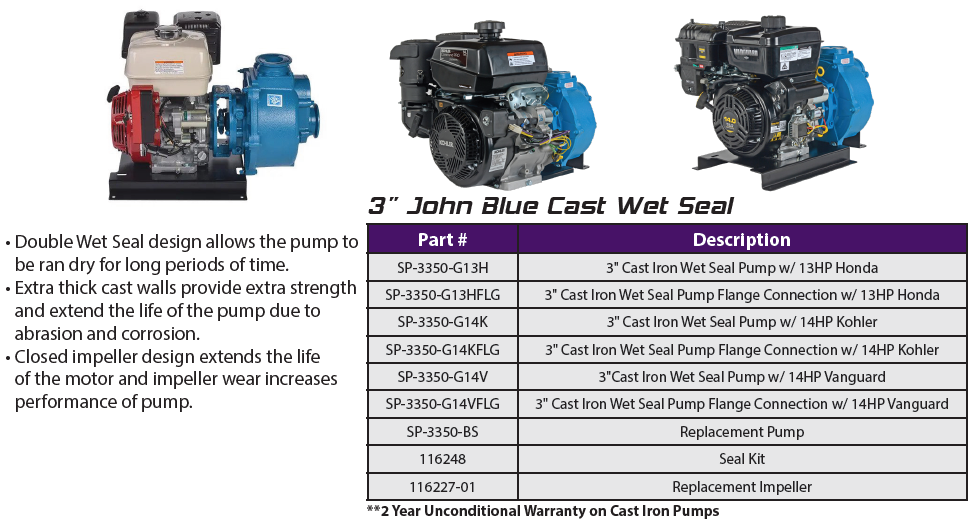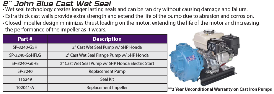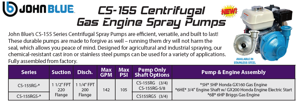All John Blue Centrifugal Transfer Pumps can run dry without damaging the seal. This, combined with a two-year factory-backed UNCONDITIONAL WARRANTY on cast-iron transfer models, makes the John Blue Centrifugal Transfer Pumps second to no other pump manufacturer on the market today — all at an affordable price. Our centrifugal pumps are available with gas, electric, or hydraulic power sources.
