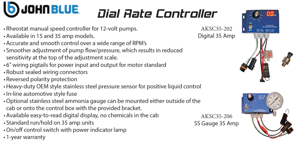 The John Blue 12-Volt Controller is available in 15 and 35 amp models. A stainless steel ammonia pressure gauge is available as an option with or without a plumbing kit. The 35 amp is also available with a digital display, which keeps pressurized fertilizers or chemicals out of the cab of the tractor. The remote stainless steel sensor has a 1/4″ NPT male fitting and uses a 20 foot wiring harness. The 35 amp control comes standard with run/ hold feature, which can be wired to your implement lift switch using a whisker or proximity switch.